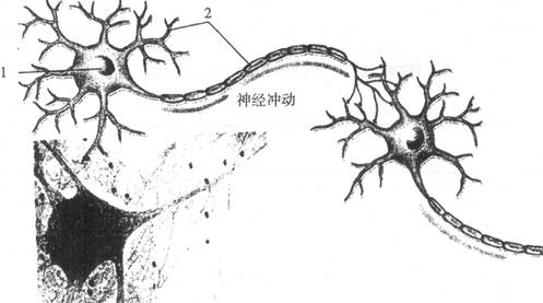 图中1是指__________,2是指__________。人体有数以__________计的神经细胞,各个神经细胞的突起与__________个神经细胞的突起相连结,形成复杂的网络。这个复杂的网络就是人体内的__________和处理系统。