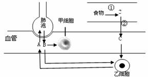 (3)在肺泡内发生气体交换后,血液发生的变化是 。物质B进入乙细胞后的作用是 。