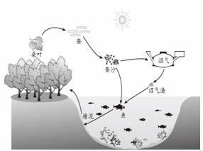4、(4分)很早以前,我国劳动人民就学会了用桑叶喂蚕、蚕沙(蚕粪)养鱼、塘泥肥桑的方法,创造了“桑基鱼塘”生态农业。随着科学技术的进步,“桑基鱼塘”也得到了发展,人们改变以蚕沙直接下鱼塘的老办法,将蚕沙、人畜粪便、秸秆、杂草、树叶等投入沼气池内发酵,制成沼气作燃料,然后再用沼渣喂鱼。这样,就把传统的“桑、蚕、鱼”农业结构,发展成了“桑、蚕、气、鱼”的新型农业结构。