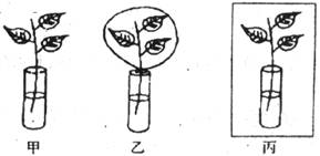 下图中的甲、乙、丙3支试管内装有等量的清水,插有形态,重量相同的枝条,均在水面上滴加一层植物油,再把乙试管口用无色透明的干燥塑料袋包严。将甲、乙两试管同时放在阳光下,丙试管放在潮湿阴暗处,几天后观察会发现: