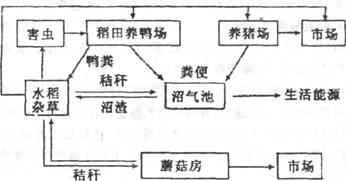 26.(10分)下图是我国某地的一个人工农业生态系统模式图,它利用鸭旺盛的杂食性,吃掉稻田里的杂草和害虫,用水稻养猪、养鸭,水稻的秸秆可以培育蘑菇、生产沼气,猪鸭粪、沼渣肥田。请据图分析回答: