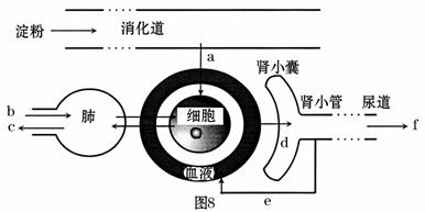 29.(6分)图8为淀粉消化后的终产物a进入血液,及其进行代谢活动的过程示意图。图中a、b、c、d、e、f分别代表人体内的物质。 请据图分析回答: