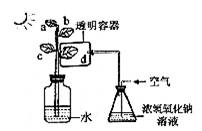 (1)清晨,把该枝条从黑暗中取出后,立即将叶片d置于右图装置中,用来探究光合作用所需的某种原料,则原料是____________。