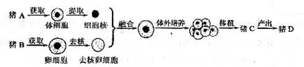(1)将胚胎植入猪C的______里,几个月后,猪C分娩产下克隆猪D。若A为雄猪,B为雌猪,则猪D的性别为________。