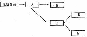(1)原始生命形成以后,由于营养方式的不同,一部分进化为不能自养的原始单细胞动物,另一部分进化成为具有叶绿体的A________________。