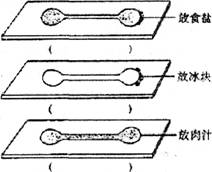 29、实验探究(3分):取三块载玻片,在每块载玻片的两端各滴一滴含有草履虫的培养液,然后把这两滴培养液连通起来。在三块载玻片相同一侧的这滴培养液中,分别放食盐、冰块(不利刺激)、肉汁(有利刺激),预测草履虫的移动方向并解决以下问题: