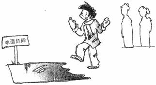 12.如图所示:湖面结冰,上面竖着一个牌子:“冰面危险”。但是小勇却说:“你们不敢上,都是胆小鬼,看我的!”