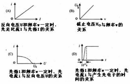 6.研究光电效应规律的实验装置如图所示,以频率为 v的光照 射光电管阴极 K时,有光电子产生。由于光电管 K、A间加的是反向电压,光电子从阴极 K发射后将向阳极 A作减速运动。光电流 I由图中电流计 G测出,反向电压 U由电压表向截止电压 U0。在下列表示光电效应实验规律的图像中,错误的是