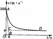 (16分)“神舟”五号飞船完成了预定的空间科学和技术实验任务后返回舱开始从太空向地球表面按预定轨道返回,返回舱开始时通过自身制动发动机进行调控减速下降,穿越大气层后,在一定的高度打开阻力降落伞进一步减速下落,这一过程中若返回舱所受空气摩擦阻力与速度的平方成正比,比例系数(空气阻力系数)为k,所受空气浮力恒定不变,且认为竖直降落。从某时刻开始计时,返回舱的运动v-t图象如图中的AD曲线所示,图中AB是曲线在A点的切线,切线交于横轴一点B,其坐标为(8,0),CD是曲线AD的渐进线,假如返回舱总质量为M=400kg,g=10m/s2,求