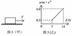 9.如图5(甲)所示,物体原来静止在水平面上,今用一水平外力F拉物体,在外力F从0开始逐渐增大的过程中,物体先静止后做变加速运动,其加速度a随外力F变化的图象如图(乙)所示。根据图5(乙)中所标示数据可计算出 ( )