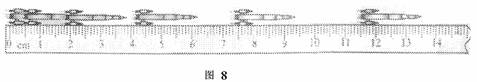 (2)(8分)在我国用长征运载火箭成功地发射了“神舟”系列试验飞船的某次实验过程中,一监测系统采用在同一底片上多次曝光的照相方法,从火箭点火时刻开始,每隔2.0s曝光一次,得到了一张记录火箭在开始运动最初10s内6个不同位置的照片。已知火箭长度为58.3m,起飞质量为479t.当地重力加速度为9.8m/s2,用刻度尺测量照片上有关长度,结果如图8所示。