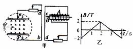 射入P1和P2两板间的匀强磁场中,ab直导线与P1P2相连接,线圈A内有随图乙所示变化的磁场,且磁场B的正方向规定向左,如图甲所示,则下列叙述正确的是 ( )