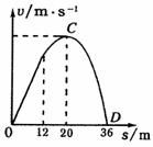 24.(16分)“蹦极”是冒险者的运动,质量为50kg的运动员,在一座高桥上做“蹦极”运动,他所用的弹性绳自由长度为12m,假设弹性绳中的弹力与弹性绳的伸长之间的关系尊容胡克定律,在整个运动中弹性绳不超过弹性限度,运动员从桥面下落,能达到距桥面为36m的最低点D处,运动员下落速度v与下落距离s的关系如图所示,运动员在C点时速度最大,空气阻力不计,重力加速度g取10m/s2,求: