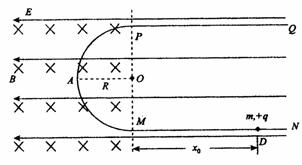 25.(18分)如图所示的竖直平面内有范围足够大、水平向左的匀强电场,在虚线的左侧有垂直纸面向里的匀强磁场,磁感应强度大小为B,一绝缘弯杆由两段直杆和一段半径为R的半圆环组成,固定在纸面所在的竖直平面内,PQ、MN水平且足够长,半圆环PAM在磁场边界左侧,P、M点在磁场边界线上,NMAP段是光滑的,现有一质量为m,带电+q的小环套在MN杆上,它所受电场力为重力的