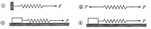 6.如图所示,四个完全相同的弹簧都处于水平位置,它们的右端受到大小皆为F的拉力作用,而左端的情况各不相同:①中弹簧的左端固定在墙上,②中弹簧的右端受大小也为F的拉力作用,③中弹簧的左端拴一小物块,物块在光滑的桌面上滑动,④中弹簧的左端拴一小物块,物块在有摩擦的桌面上滑动。若认为弹簧的质量都为零,以△l1、△l2、△l3、△l4依次表示四个弹簧的伸长量,则有 ( )
