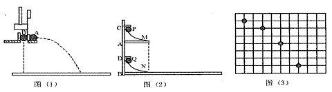 (2).乙同学采用如图(2)所示的装置。两个相同的弧形轨道M、N,分别用于发射小铁球 P、Q,其中N的末端与可看作光滑的水平板相切;两轨道上端分别装有电磁铁C、D;调节电磁铁C、D的高度,使AC=BD,从而保证小铁球P、Q在轨道出口处的水平初速度v0相等,现将小铁球P、Q分别吸在电磁铁C、D上,然后切断电源,使两小铁球能以相同的初速度v0同时分别从轨道M、N的下端射出。实验可观察到的现象应是 。仅仅改变弧形轨道M的高度,重复上述实验,仍能观察到相同的现象,这说明 。