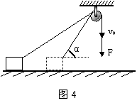 12、如图4所示,质量为m的物体置于光滑水平面上,一根绳子跨过定滑轮一端固定在物体上,另一端在力F作用下,以恒定速率v0竖直向下运动,物体由静止开始运动到绳与水平方向夹角α=45°过程中,绳中张力对物体做的功为 。