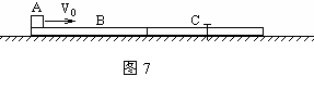 18、(13分)如图7所示,三个质量均为m的物体A、B、C,其中木板B、C完全相同,长度都为L,水平地面光滑,可以看作质点的物体A以初速度V0冲上的木板B。第一次木板C被用钉子固定在地面上,A冲上后刚好未滑离B板就停下,该过程产生热量为Q1 ; 第二次C木板被放开,A以同样初速冲上B后直到它们稳定,该过程产生热量为Q2 。求: