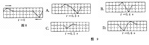 / s 的速率沿同一直线相向传播,t=0时刻的图形如图8所示,图9中小方格的边长为0.lm ,则以下不同时刻波形正确的是 ( )