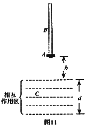 19.(18分)在地面上方,一小圆环A套在一条均匀直杆B上,A和B的质量均为m,它们之间的滑动摩擦力f =0.5mg.开始时A处于B的下端,B竖直放置.在A的下方h=0.20m处,存在一个“相互作用”区域C,区域C的高度d =0.30m,固定在空中如图11中划有虚线的部分.当A进入区域C时,A就受到方向向上的恒力F作用,F =2mg.区域C对杆B不产生作用力.A和B一起由静止开始下落,已知杆B落地时A和B的速度相同.不计空气阻力,重力加速度g=10m/s2.求杆B的长度l至少应为多少?