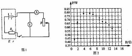 ②根据实验所测得的数据,已计算出电阻R在不同阻值下的电源输出功率P的值,描出的点如图2所示。请你根据这些点画出P-R的关系图线。