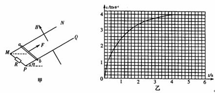 25.(18分)光滑平行的金属导轨MN和PQ,间距L=1.0m,与水平面之间的夹角α=30°,匀强磁场磁感应强度B=2.0T,垂直于导轨平面向上,MP间接有阻值R=2.0Ω的电阻,其它电阻不计,质量m=2.0kg的金属杆ab垂直导轨放置,如图甲所示。用恒力F沿导轨闰面向上拉金属杆ab,由静止开始运动,v-t图像如图乙。g=10m/s2,导轨足够长,求: