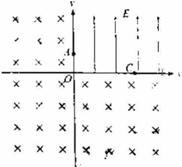 (20分)如图所示,在坐标系Oxy的第一象限中存在沿y轴正方向的匀速磁场,场强大小为E。在其它象限中存在匀强磁场,磁场方向垂直于纸面向里。A是y轴上的一点,它到坐标原点O的距离为h;C是x轴上的一点,到O的距离为L。一质量为m,电荷量为q的带负电的粒子以某一初速度沿x轴方向从A点进入电场区域,继而通过C点进入磁场区域。并再次通过A点,此时速度方向与y轴正方向成锐角。不计重力作用。试求: