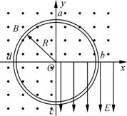15.(10分)如图所示,一绝缘圆环轨道位于竖直平面内,半径为R,空心内径远小于R,以圆环圆心O为原点在环面建立平面直角坐标系xoy,在第四象限加一竖直向下的匀强电场,其他象限加垂直环面向外的匀强磁场.一带电量为+q、质量为m的小球在轨道内从b点由静止释放,小球刚好能顺时针沿圆环轨道做圆周运动,求: