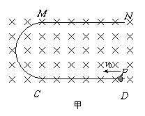 (1)若整个装置处在方向与之垂直、磁感应强度为B的匀强磁场中,如图(甲)所示。小球P以一定的初速度v0从D端出发,沿杆滑到M点以后恰好在细杆MN上匀速运动。求: