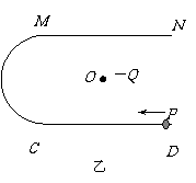 (2)撤去磁场,在MD、NC连线的交点O处固定一电荷量为Q的负电荷,如图(乙)所示,使小球P从D端出发沿杆滑动,滑到N点时速度恰好为零。(已知小球所受库仑力始终小于重力)求: