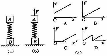 2.如图(a)所示,水平面上质量相等的两木块A、B用一轻弹簧相连接,整个系统处于平衡状态. 现用一竖直向上的力F拉动木块A,使木块A向上做匀加速直线运动,如图(b)所示. 研究从力F刚作用在木块A的瞬间到木块B刚离开地面的瞬间这一过程,并且选定该过程中木块A的起点位置为坐标原点,则图(c)中可以表示力F和木块A的位移x之间关系的是 ( )