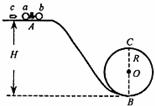 21.小球a、b用一处于原长的微型轻质弹簧连接,静止在高度H=1m的平台上A处,a和b的质量分别为0.09kg和0.1kg. 一颗质量为m0=0.01kg的子弹c以v0=400m/s的初速度水平射入a并留在其中,当弹簧压缩到最短时使弹簧处于锁定状态,之后它们共同沿粗糙曲面AB滑下,经过B点后,进入竖直平面的圆形光滑轨道,并能通过圆轨道的最高点C. 已知圆轨道半径R=0.4m,当ab到达C位置时弹簧在极短时间内解除锁定并迅速与a、b分离,分离后a的速度恰好为零而b继续沿圆周运动. 将ab以及弹簧组成的系统看成质点,不计弹簧压缩和弹开的时间,设a球落下后不会与b球相碰,求小球b第2次到达B处时对轨道的压力及子弹和a、b在AB段克服阻力所做的功.(取g=10m/s2)