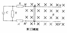 13.(8分)两根光滑的长直金属导轨MN、M′N′平行置于同一水平面内,导轨间距为l,电阻不计,M,M′处接有如图所示的电路,电路中各电阻的阻值均为R,电容器的电容为C,长度也为l、阻值同为R的金属棒ab垂直于导轨放置,导轨处于磁感应强度为B、方向竖直向下的匀强磁场中,ab在外力作用下向右匀速运动且与导轨保持良好接触,在ab运动距离为s的过程中,整个回种中产生的焦耳热为Q,求: