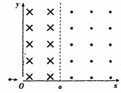 16.(11分)两平面荧光屏互相垂直放置,在两屏内分别取垂直于两屏交线的直线为x轴和y轴,交点O为原点,如图所示,在y>0,0<x<a的区域有垂直于纸面向里的匀强磁场,在y>0,x>a的区域有垂直于纸面向外的匀强磁场,两区域内的磁感应强度大小均为B。在O点处有一小孔,一束质量为m、带电量为q(q>0)的粒子沿x轴经小孔射入磁场,最后打在竖直和水平荧光屏上,使荧光屏发亮。入射粒子的速度可取从零到某一最大值之间的各种数值。已知速度最大的粒子在0<x<a的区域中运动的时间与在x>a的区域中运动的时间之比为2;5,在磁场中运动的总时间为7T/12,其中T为该粒子在磁感应强度为B的匀强磁场中做圆周运动的周期,试求两个荧光屏上亮线的范围(不计重力的影响)。