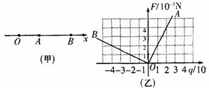 19.如图(甲)所示,在x轴上有一个点电荷Q(图中未画出),O、A、B为轴上三点,放在A、B两点的检验电荷受到的电场力跟检验电荷所带电荷量的关系如图(乙)所示。则( )