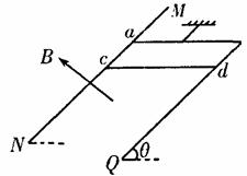 22.如图所示,MN、PQ是与水平面成θ角的两条平行光滑且足够长的金属导轨,其电阻忽略不计。空间存在着垂直于轨道平面向上的匀强磁场,磁感应强度大小为B。导体棒ab、cd垂直于导轨放置,且与轨道接触良好,每根导体棒的质量均为m,电阻均为r,轨道宽度为L。与导轨平行的绝缘细线一端固定,另一端与ab棒中点连接,细线承受的最大拉力Tm=2mgsinθ。今将cd棒由静止释放,则细线被拉断时,cd棒的 ( )