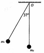 悬挂m2的细线处于竖直状态,悬挂m1的细线处于伸直状态且与竖直方向成37°角。现将m1由静止释放,m1与m2碰撞后粘在一起。若线长L=1m,重力加速度g=10m/s2,取sin37°=0.6,cos37°=0.8,求: