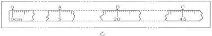 在实验中,桌子边缘与木板之间的水平距离依次为20cm,40cm,60cm时,记录钢球打在木板上的落点分别是A、B、C,O是与桌面等高的点。将白纸从木板上取下,把毫米刻度尺的零刻度线对准O点,如图乙所示(g=10m/s2)。
