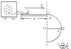 24.(16分)某塑料球成型机工作时,可以喷出速度v0=10m/s的塑料小球,已知喷出的每个小球的质量m=1.0×10-4kg,并且在时喷出时已带了q=-1.0×10-4C的电荷量。如图所示,小球从喷口飞出后,先滑过长d=1.5m的水平光滑的绝缘轨道,而后又过半径R=0.4m的圆弧形竖立的光滑绝缘轨道。今在水平轨道上加上水平向右的电场强度大小为E的匀强电场,小球将恰好从圆弧轨道的最高点M处水平飞出;若再在圆形轨道区域加上垂直纸面向里的匀强磁场后,小球将恰好从圆弧轨道上与圆心等高的N点脱离轨道,最后落入放在地面上接地良好的金属容器内,g=10m/s2,