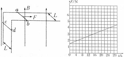 25.(18分)相距为L=0.20m的足够长的金属直角导轨如图所示放置,它们各有一边在同一水平面内,另一边垂直于水平面。质量均为m=1.0kg的金属细杆ab、cd与导轨垂直接触形成闭合回路,杆与导轨之间的动摩擦因数均为μ,导轨电阻不计,回路总电阻为R=1.0Ω。整个装置处于磁感应强度大小为B=0.50T,方向竖直向上的匀强磁场中。当ab杆在平行于水平导轨的拉力F作用下从静止开始沿导轨匀加速运动时,cd杆也同时从静止开始沿导轨向下运动。测得拉力F与时间t的关系如图所示。g=10m/s2,