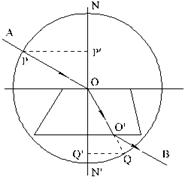 (2)以通过P1、P2的直线OA与玻璃砖的交点O为圆心,以某一适当长度R为半径画圆,与OA交于P ,与OO′的延长线交与Q ,如下图所示,从P、Q两点分别作玻璃砖界面的法线NN′的垂线,垂足分别为P′、Q′,用刻度尺量得PP′= 45mm,QQ′= 30mm,则玻璃砖的折射率为 。