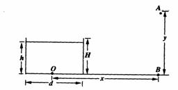 26.(10分)如图所示,水平地面上有一个圆槽,直径d=1.00m,高H=0.50m,底面圆心为O.一个人站在地面上B点,眼睛处于A点.BO间的距离x=2.10 m,AB高y=1.70 m.现在往槽内倒人折射率n=1.60的透明液体后,在A点恰能看到槽底中心O点.求液体的高度h.