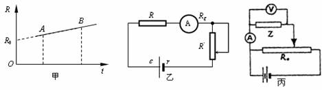 (1)如图(甲)是某金属材料制成的电阻R随摄氏温度t变化的图象,图中R0表示0℃时的电阻,k表示图线的斜率.若用该电阻与电池(E、r)、电流表Rg、滑动变阻器R′ 串联起来,连接成如图(乙)所示的电路,用该电阻做测温探头,把电流表的电流刻度改为相应的温度刻度,就得到了一个简单的“金属电阻温度计”.使用“金属电阻温度计”前,先要把电流表的刻度值改为相应的温度刻度值,若温度t1<t2,则t1的刻度应在t2的________侧(填“左”、“右”);在标识“金属电阻温度计”的温度刻度时,需要弄清所测温度和电流的对应关系.请用k、E、R0、R、r、Rg等物理量表示所测温度t与电流I的关系式t=__________ 。
