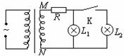 21、如图所示理想变压器的副线圈上通过输电线接两个相同的灯泡L1和L2。输电线的等效电阻为R。开始时电键K断开。当K接通后,以下说法正确的是 ( )