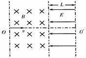 24.(17分)如图所示,有界匀强磁场宽度为L=0.2m、磁感应强度B=2×10-3T;磁场右边宽度也为L=0.2m、场强E=40V/m、方向向左的匀强电场.一带电粒子电荷量q=-3.2×10-19C,质量m=6.4×10-27Kg,以v=4×104m/s的速度沿OO’垂直射入磁场,在磁场中偏转后进入右侧的电场,最后从电场右边界射出.求: