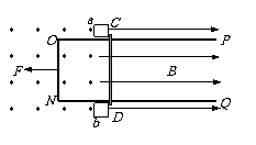 一个" "形导轨PONQ,其质量为M=2.0kg,放在光滑绝缘的水平面上,处于匀强磁场中,另有一根质量为m=0.60kg的金属棒CD跨放在导轨上,CD与导轨的动摩擦因数是μ=0.20,CD棒与ON边平行,左边靠着光滑的固定立柱A.b,匀强磁场以ab为界,左侧的磁场方向竖直向上(图中表示为垂直于纸面向外),右侧磁场方向水平向右,磁感应强度的大小都是B=0.80T,如图所示.已知导轨ON段长L=0.50m,电阻R=0.40Ω,金属棒CD的电阻r=0.20Ω,其余电不计.导轨在水平拉力作用下由静止开始以a=0.20m/s2的加速度做匀加速直线运动,一直到CD中的电流达到I=4.0A时,导轨改做匀速直线运动.设导轨足够长,取g=10m/s2.求: