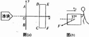 ,后一段路面与冰块的动摩擦因数很小可忽略不计。为防止仪器受损,值勤战士在前一段中,迅即逆着与冰块滑来的水平方向成37°斜向下用F=875N的力阻挡冰块滑行,如图(b)所示。设冰块的初速度为v0=6.00m/s,在前一段路沿直线滑过4.00m后,到达两段路面的分界线。冰块进入后一段路面后,值勤战士再沿垂直v0的方向(y轴正方向),用相同大小的力侧推冰块。(取g=10m/s2;以分界线为y轴,冰块的运动方向为x轴建立平面直角坐标系。)求: