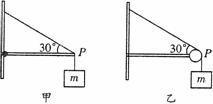 2. 如图甲中一水平轻杆左端和竖直杆无摩擦连接,可在竖直方向转动,在右端的P点系有两根细线,一根斜上拉且固定,另一根竖直向下连接质量为m的物体而处于平衡状态. 图乙中水平轻杆左端固定,右端连接一个光滑滑轮,用细线绕过滑轮,上端固定而下端连接与甲同样的物体,处于平衡状态. 下列说法中正确的是( )
