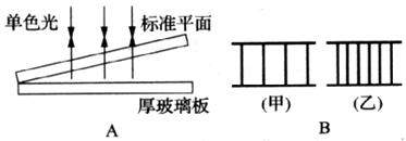 两束单色光分别照射该劈形装置,从劈形装置的上方向下可以看到图B所示的干涉图样,其中B图中(甲)是