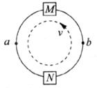 3.如下图所示,竖直放置的M和N,其中一个是电源,另一个是小灯泡,用环形裸导线连接。在环内有一带电的粒子沿逆时针方向做圆周运动,用电压表测得